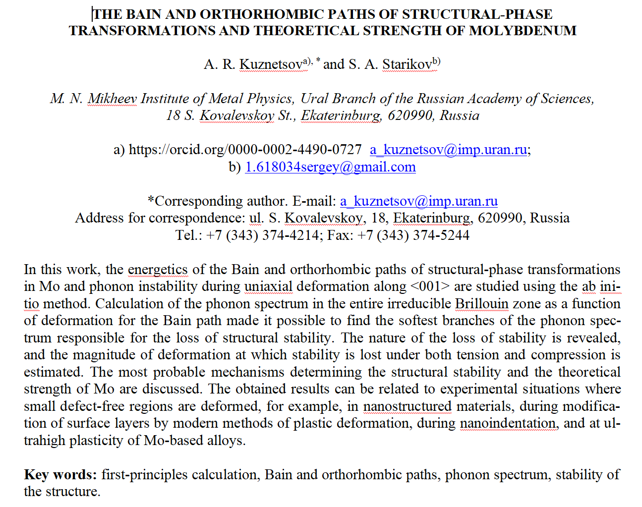 Kuznetsov A. R., Starikov S. A. The Bain and Orthorhombic Paths of the Structural and Phase Transformations and Theoretical Strength of Molybdenum // Diagnostics, Resource and Mechanics of materials and structures. -